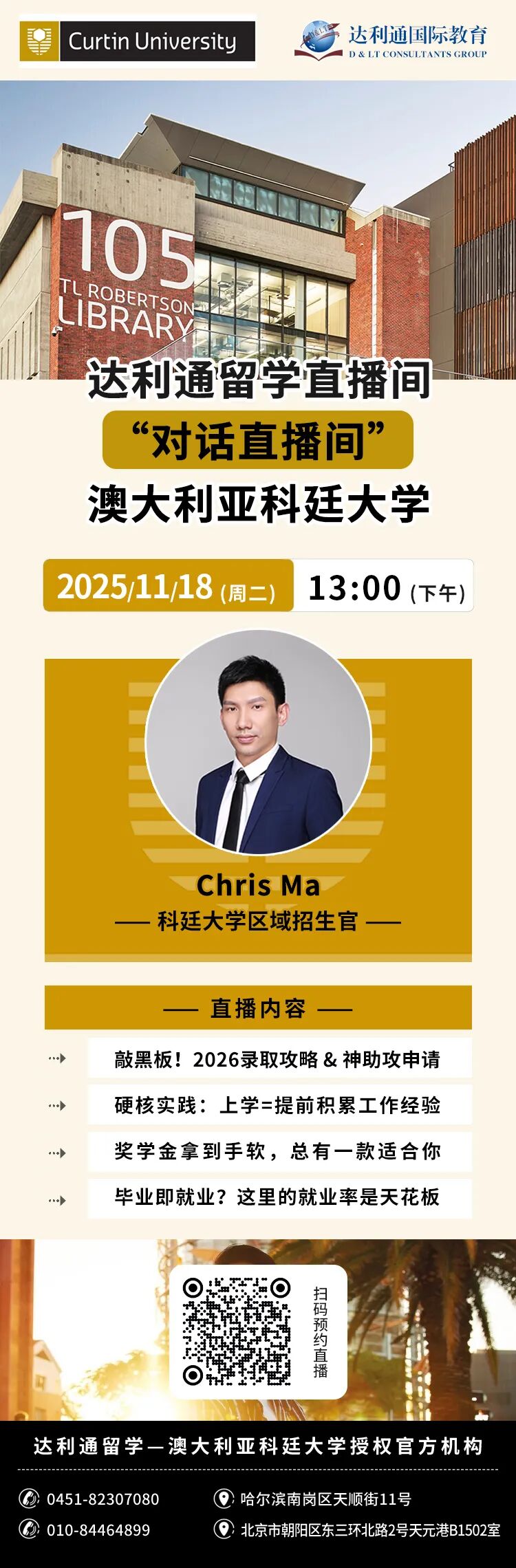 锁定达利通留学直播间,走进世界名校科廷大学,招生官将代领大家沉浸式体验校园现代化教学环境,分享海外留学的真实生活感受,解答关于留学珀斯与报读科廷的常见问题!
